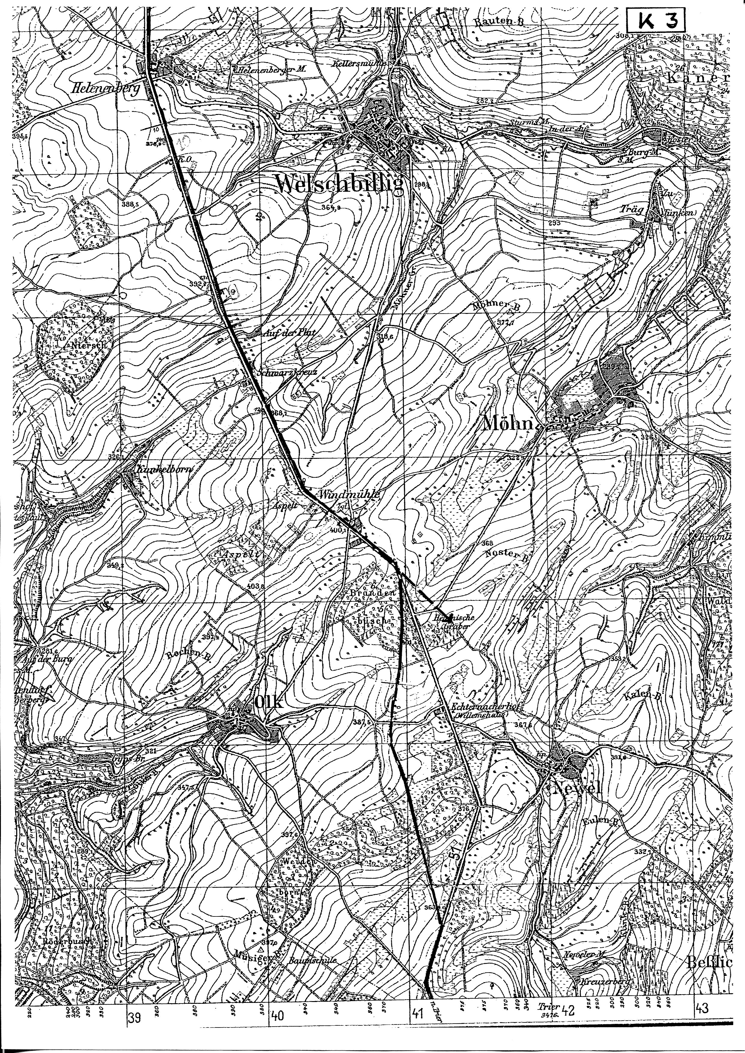 Die römische Trasse knickt 150 m südlich der Straße Newel - Olk von ca. 348° auf 6°. Die Gemeindegrenze läuft von diesem Knickpunkt nahezu gerade 1,1 km nördlich in den Zusammenschluss mit der Fahrstraße aus dem Biewertal.