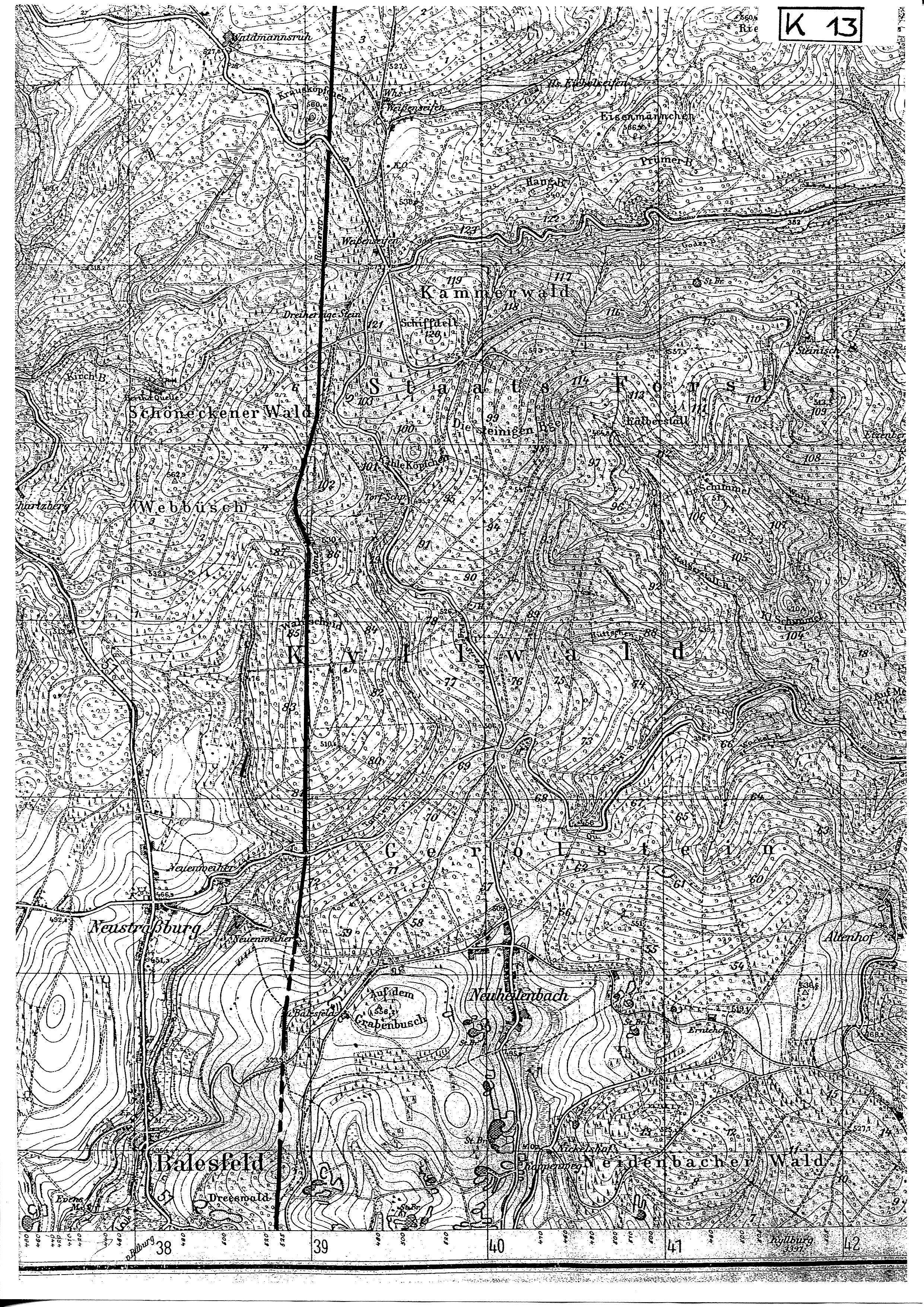 Nördlich des Dreeskopfes ist die Straße im Luftbild sichtbar. Sie geht unbeirrt nordwärts, während die Departementgrenze nach Osten auf den Pilgerweg Aachen-(Köln)-Prüm-Trier abbiegt. Bis zum Tannenbach lässt sich der Höhenunterschied gut verteilen (4,3%). Am letzten Bauernhof vom Ortsteil Neuenweiher - genannt „Hof’ - mit Brunnen verläuft die Straße zwischen Balesfeld und Neuheilenbach, 130 m lang auch die Gemeindegrenze bildend.
