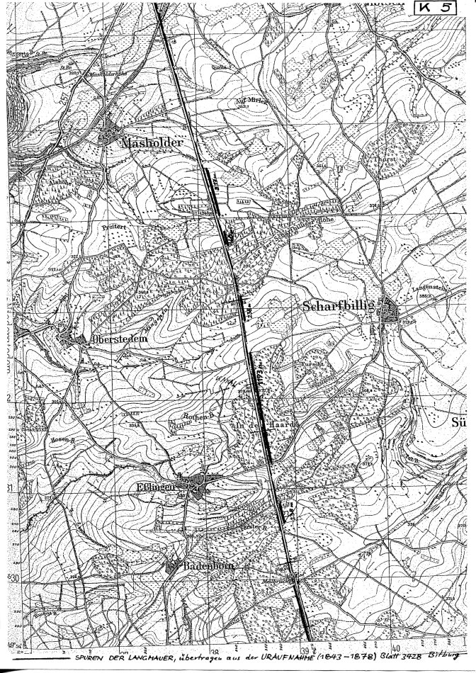 In der TK 1:25000 (Ausschnitt) deutet sich die Richtung der Talquerung im ersten Dammstück noch an : 354,5°, dann knickt die Trasse nach Osten bei 4,5°. Der Grund hierfür ist verständlich : Die Straße wird durch eine Zertalung (Quertal) von Osten her in der Wasserscheidenlage auf einen engen Bereich reduziert. Konnte sie diese „Bedrohung’ durch den Knick auf 4,5° bereits 700 m vorher ausgleichen, so muss sie der nun folgenden zweiten Zertalung von Osten her ausweichen. Die Lösung : 338° auf 250 m Länge, dann Knick auf 15° auf 800 m Länge bis zur „Kaisereiche“. Dort ist wieder Anschluss an die Großrichtung von knapp 6°, die auf gut 6 km bis zum Vogelsheck eingehalten wird, ausgenommen zwei kleinräumige Probleme im Wallersheimer Wald.