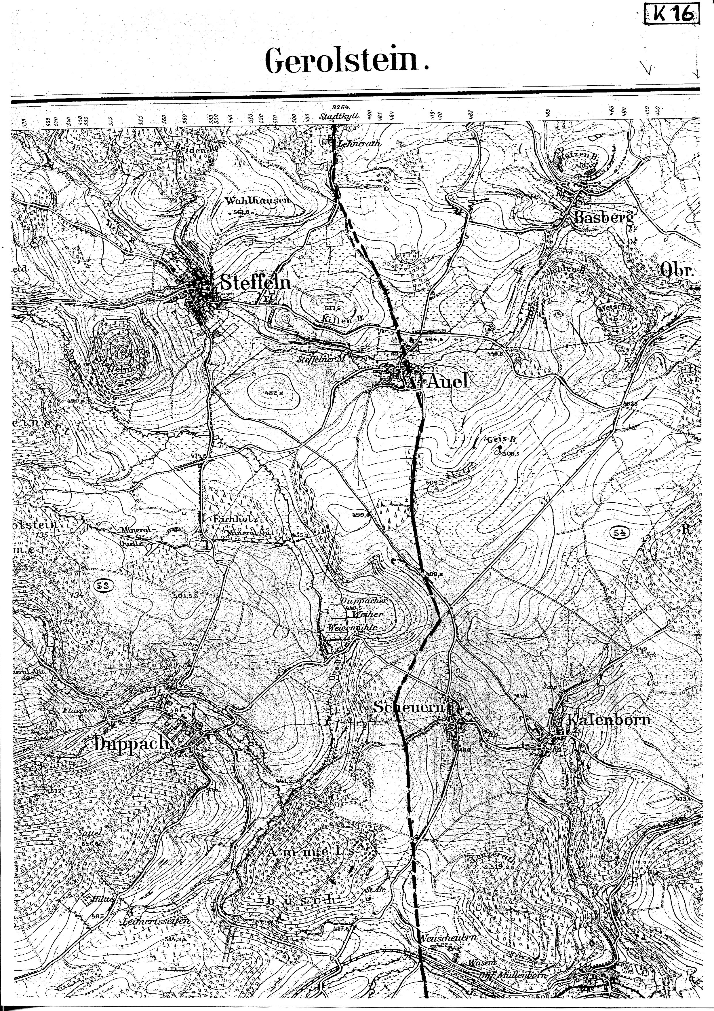 In Auel zeigt eine Parzellengrenze in der Neuaufnahme von 1894 den Verlauf der Straße nach Lehnerath südlich der K52 an. In der preussischen Ur- und Neuaufnahme 5605 Stadtkyll ist sie nördlich der K52 vollständig sichtbar, auch Luftbilder und die Forstkarte Prüm von 1940 zeigen ihre Lage. Auf 500 m der Gemeindegrenze (1809/10) Steffeln-Oberbettingen bildet die Straße die Markierung.