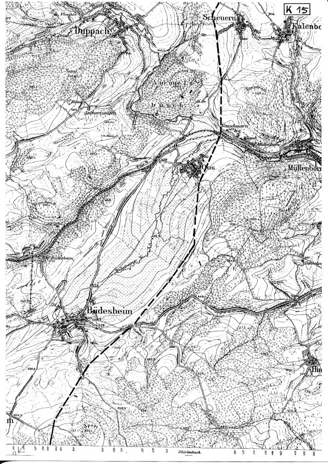 Im Einzelnen : Die Tranchot-und-Müffling-Karte von 1809 zeigt den ursprünglichen Verlauf : nach 700 m Wasserscheidenlage knickt die Trasse um 12° nach Westen, nach weiteren 625 m nun 10° nach Westen, nach weiteren 600 m 27° nach Westen, um den bestmöglichen Übergang über den Oosbach zu erreichen. Nördlich der Brücke führt ein Weg zielstrebig in Richtung Scheuern - er könnte der Fortsetzung entsprechen, insbesondere da eine ca. 700 m gerade Trasse bis in Höhe Scheuren sich anschliesst (T+M Blatt 154 Gerolstein). Nicht unerwähnt bleiben soll, dass auf zwei Grundstücken direkt an der so genannten Römerstraße Spuren zu sehen, bzw. zu sehen gewesen sind : Auf dem Grundstück Benz ein Damm, auf dem Grundstück des Landwirts Schauster die Fortsetzung dieses Damms. Die Römerstraße durchläuft nacheinander einen nach Osten und dann einen nach Westen gerichteten geöffneten Halbkreis. In dem zweiten lag der umfangreiche Duppacher Weiher. Mit letzterem erklärt sich auch die Abknickung nach Nordwesten in Richtung Auel.