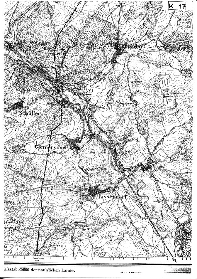 Auf der Höhe 515,7 m vor dem Lehnerath-Kreuz geht es steil abwärts - Spuren nicht sichtbar bis zum letzten Gebäude-Komplex, einem Bauernhof, auf der Nordseite der L25. Nördlich dieses Bauernhofes ist die ehemalige Lage des Damms (h=502m) deutlich erkennbar (UR 1846/Neu/Forstkarte Prüm 1940). Der Eigentümer, Landwirt Peters, hat uns erklärt, dass man nach Rodung des Grünstreifens, der den Damm begleitet hat, letzteren mühsam abgetragen habe. Der heutige Zustand zeigt den Damm immer noch in seinem Grundriss trotz Abtragung, da der Mutterboden nicht ersetzt worden ist. Im Bereich der Hofgebäude befindet sich ein gut erkennbares Hohlweg-Stück.