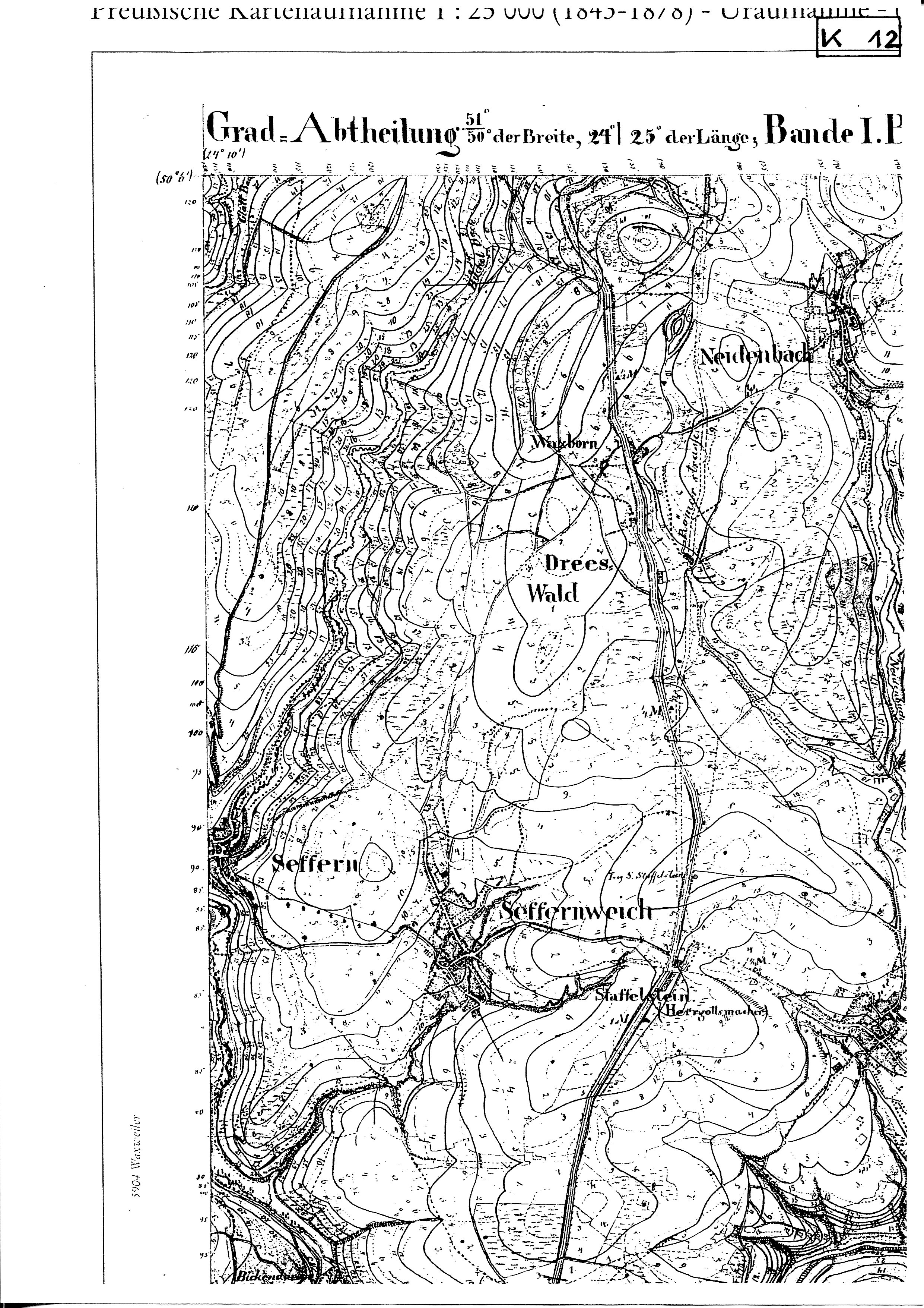 In der TK 1:25000 (Ausschnitt) deutet sich die Richtung der Talquerung im ersten Dammstück noch an : 354,5°, dann knickt die Trasse nach Osten bei 4,5°. Der Grund hierfür ist verständlich : Die Straße wird durch eine Zertalung (Quertal) von Osten her in der Wasserscheidenlage auf einen engen Bereich reduziert. Konnte sie diese „Bedrohung’ durch den Knick auf 4,5° bereits 700 m vorher ausgleichen, so muss sie der nun folgenden zweiten Zertalung von Osten her ausweichen. Die Lösung : 338° auf 250 m Länge, dann Knick auf 15° auf 800 m Länge bis zur „Kaisereiche“. Dort ist wieder Anschluss an die Großrichtung von knapp 6°, die auf gut 6 km bis zum Vogelsheck eingehalten wird, ausgenommen zwei kleinräumige Probleme im Wallersheimer Wald.